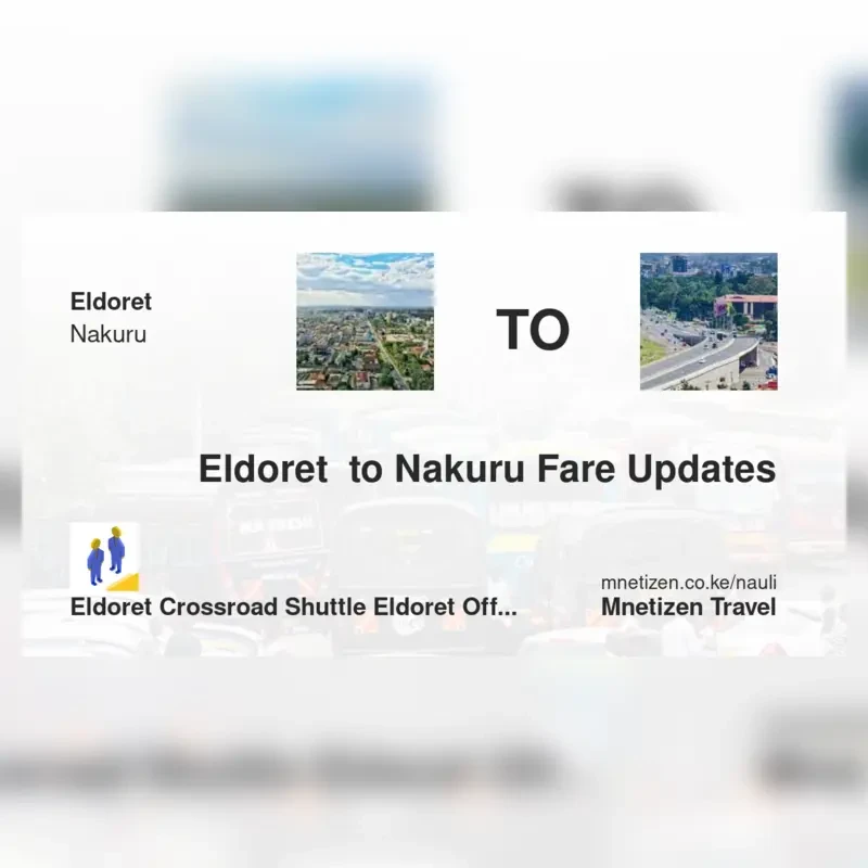 The fare from Eldoret to Nakuru with Eldoret crossroad shuttle Eldoret office is . Prices may vary during holidays and school terms.