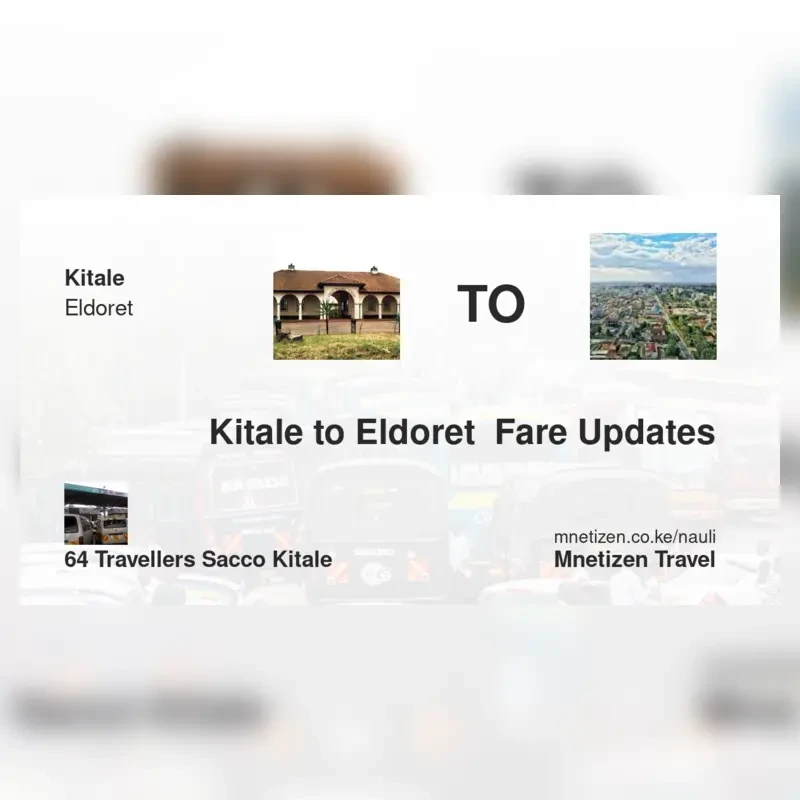 The fare from Kitale to Eldoret with 64 Travellers SACCO kitale is ksh 350. Prices may vary during holidays and school terms.
