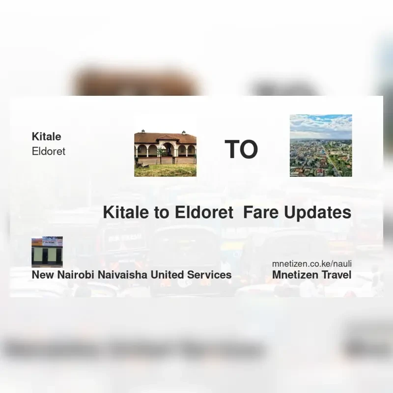 The fare from Kitale to Eldoret with New Nairobi naivaisha United Services is ksh 350. Prices may vary during holidays and school terms.