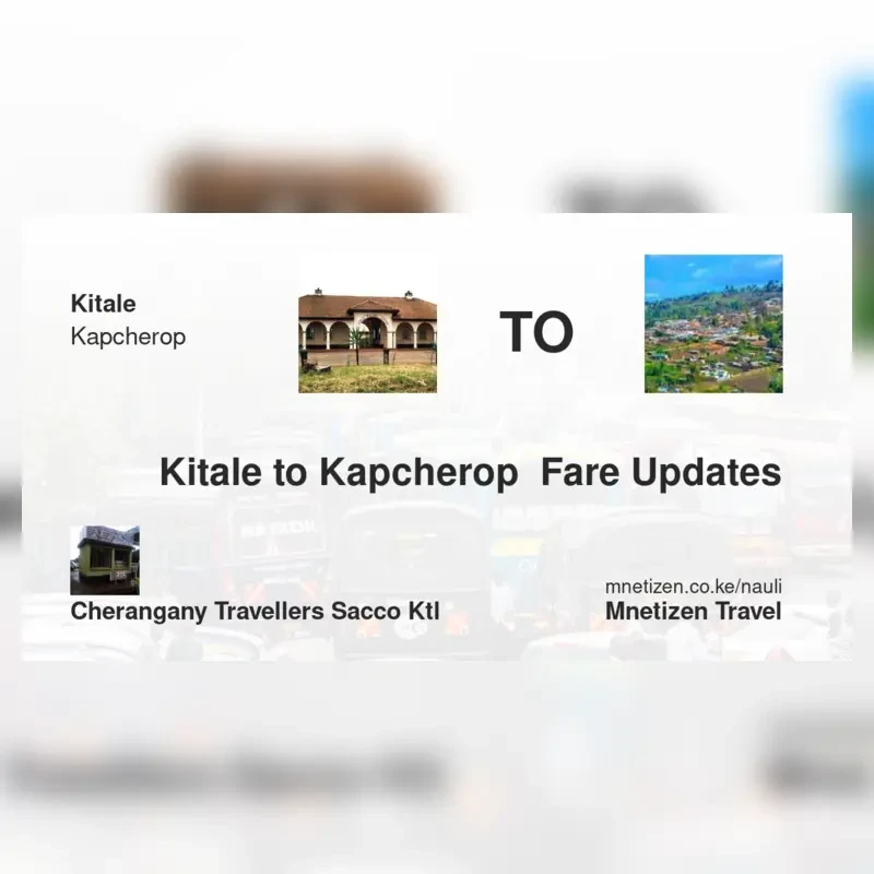 The fare from Kitale to Kapcherop with Cherangany Travellers SACCO ktl is ksh 300. Prices may vary during holidays and school terms.
