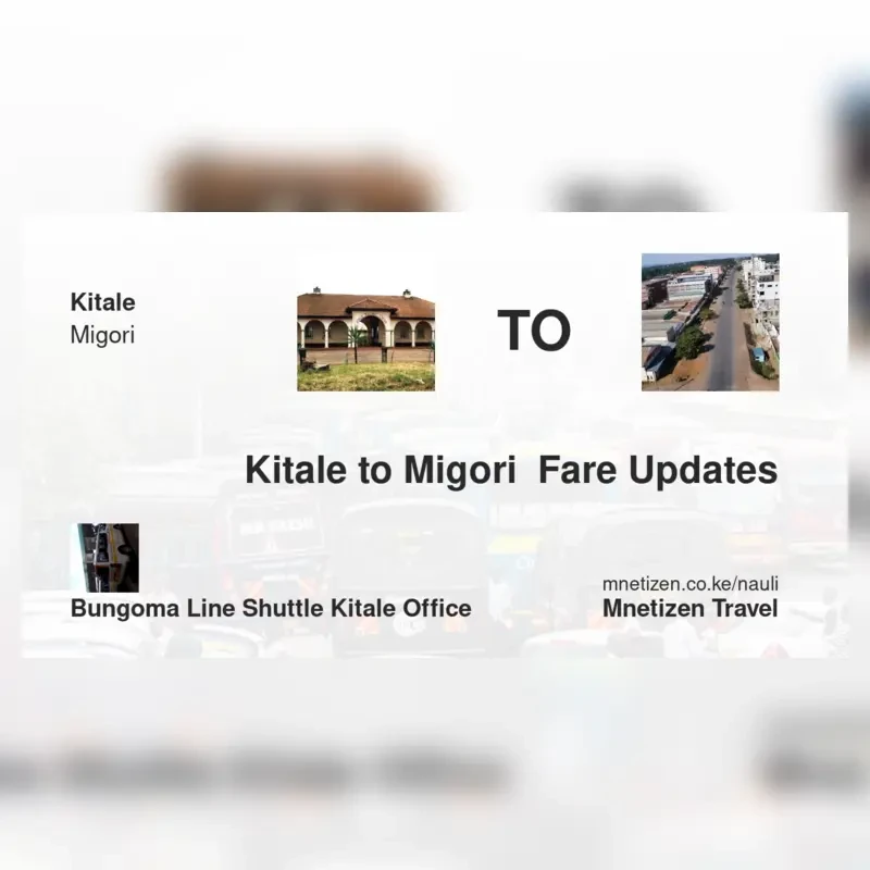 The fare from Kitale to Migori with Bungoma line shuttle Kitale office is ksh 1,300. Prices may vary during holidays and school terms.