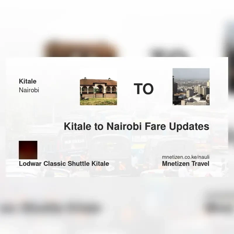 The fare from Kitale to Nairobi with Lodwar Classic shuttle kitale is ksh 1,500. Prices may vary during holidays and school terms.