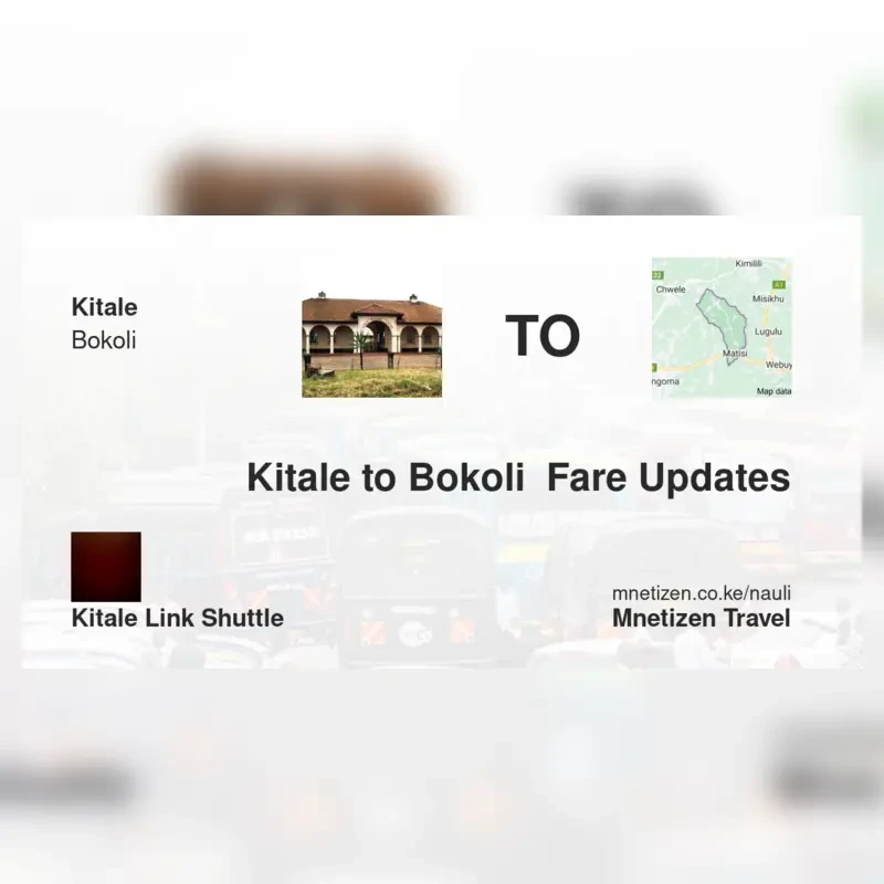The fare from Kitale to Bokoli with Kitale Link shuttle is . Prices may vary during holidays and school terms.