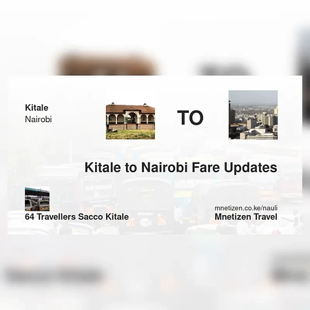 The fare from Kitale to Nairobi with 64 Travellers SACCO kitale is ksh 1,500. Prices may vary during holidays and school terms.