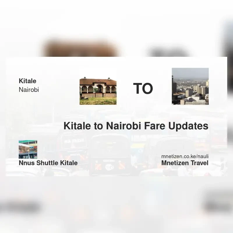 The fare from Kitale to Nairobi with Nnus shuttle Kitale is . Prices may vary during holidays and school terms.