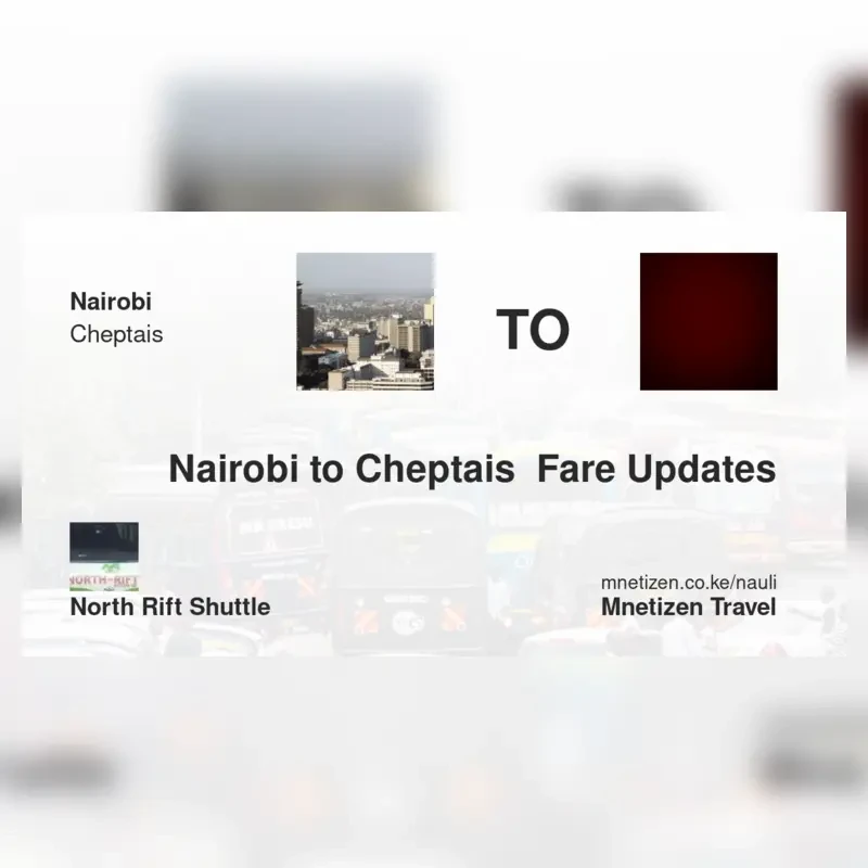 The fare from Nairobi to Cheptais with North Rift Shuttle is ksh 1,700. Prices may vary during holidays and school terms.