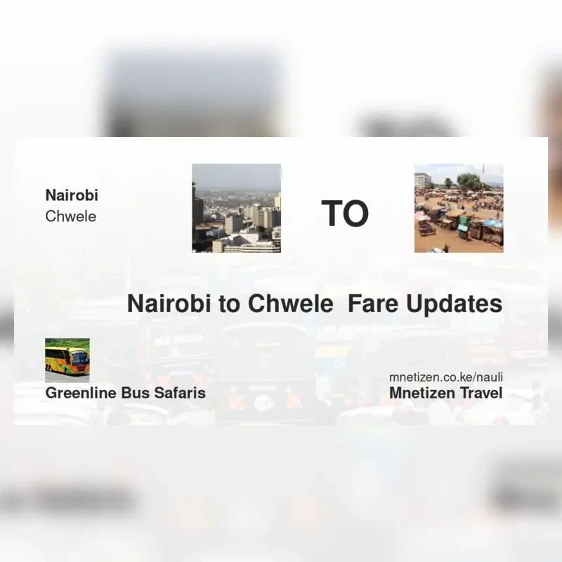The fare from Nairobi to Chwele with Greenline Bus Safaris is ksh 1,400. Prices may vary during holidays and school terms.