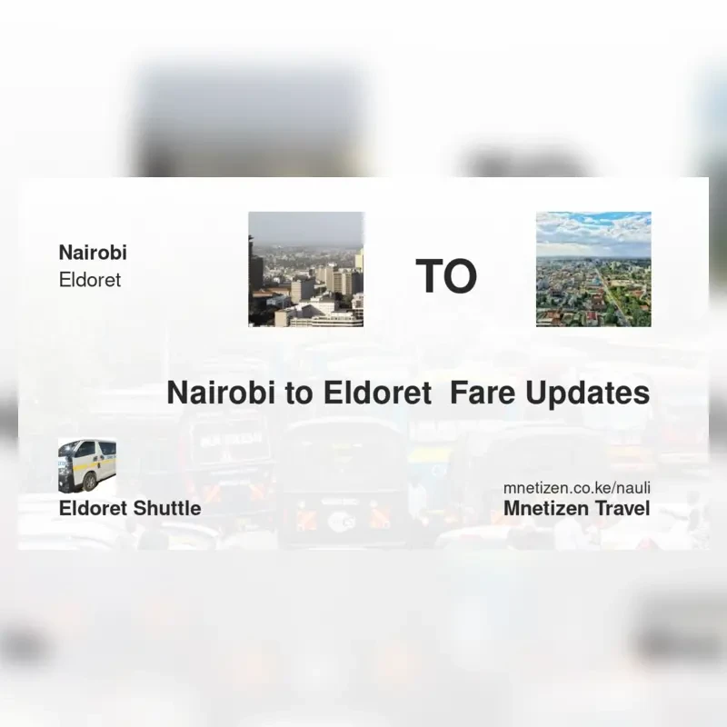 The fare from Nairobi to Eldoret with Eldoret Shuttle is ksh 1,200. Prices may vary during holidays and school terms.