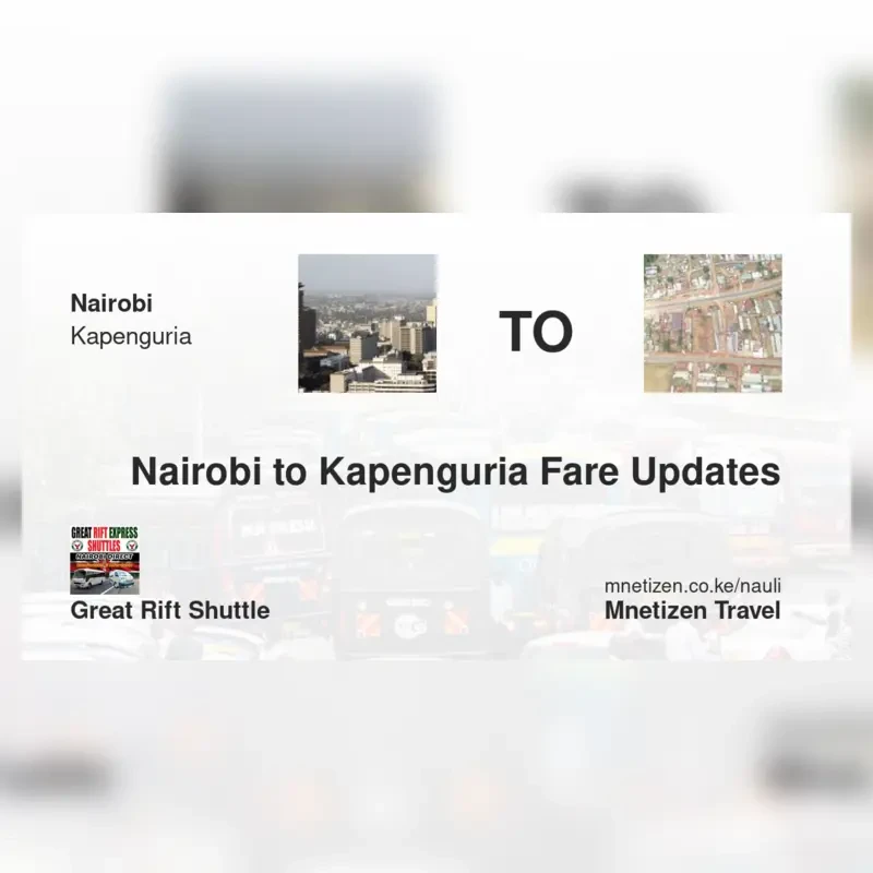 The fare from Nairobi to Kapenguria with Great rift shuttle is ksh 1,600. Prices may vary during holidays and school terms.