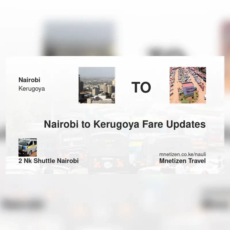The fare from Nairobi to Kerugoya with 2NK Shuttle Nairobi is ksh 500. Prices may vary during holidays and school terms.