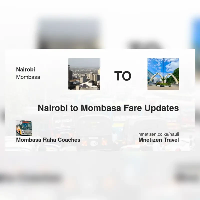 The fare from Nairobi to Mombasa with Mombasa Raha Coaches is ksh 1,300. Prices may vary during holidays and school terms.