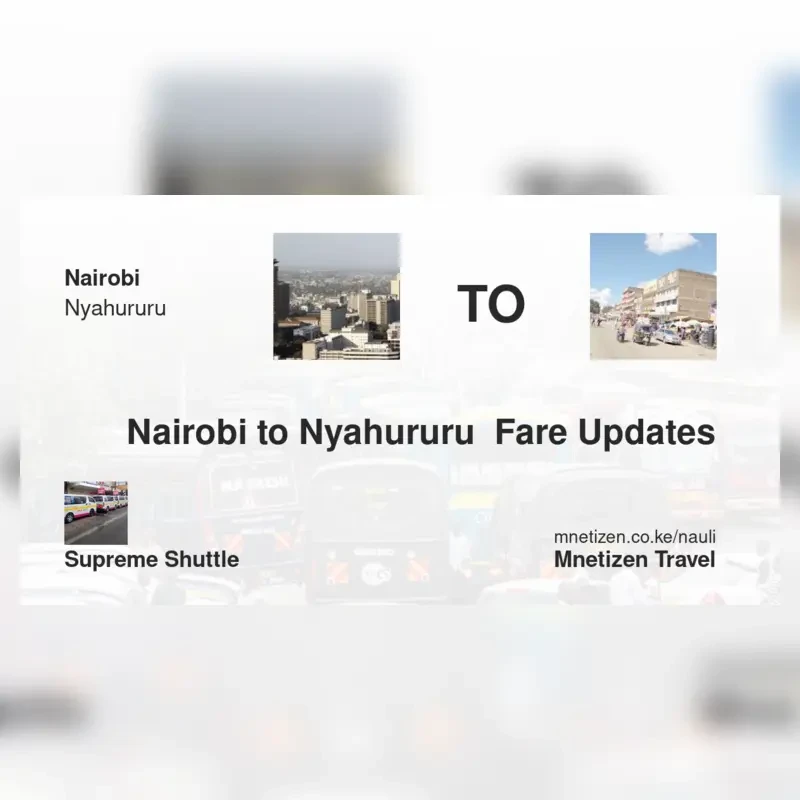 The fare from Nairobi to Nyahururu with Supreme Shuttle is . Prices may vary during holidays and school terms.