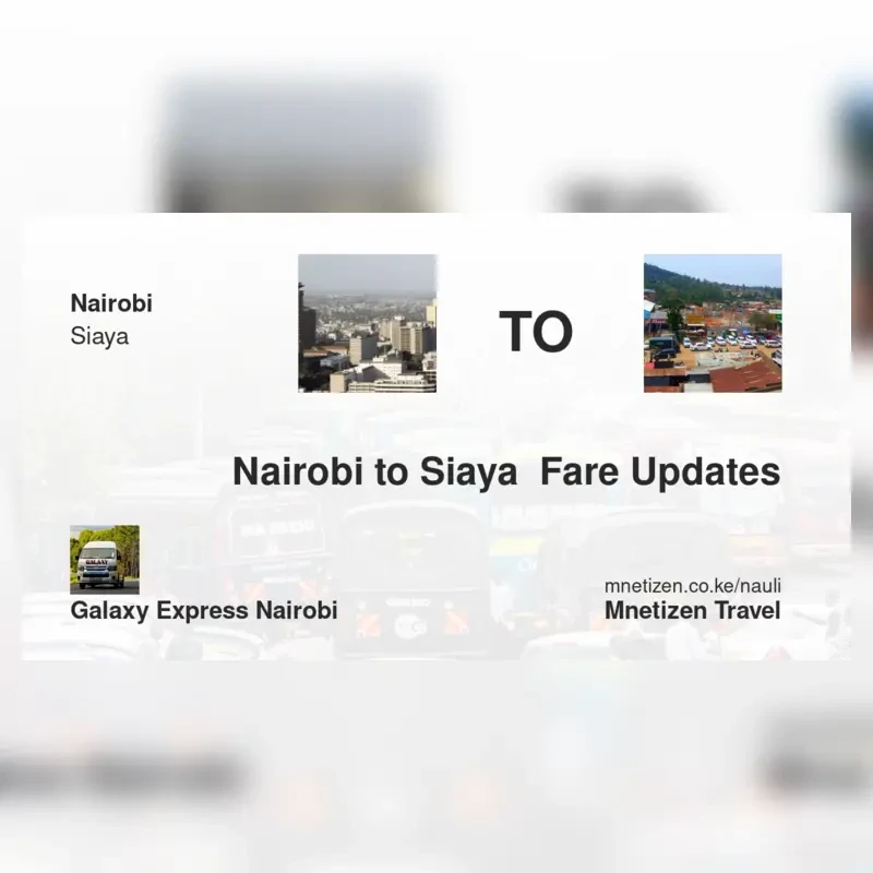 The fare from Nairobi to Siaya with Galaxy Express Nairobi is ksh 1,900. Prices may vary during holidays and school terms.