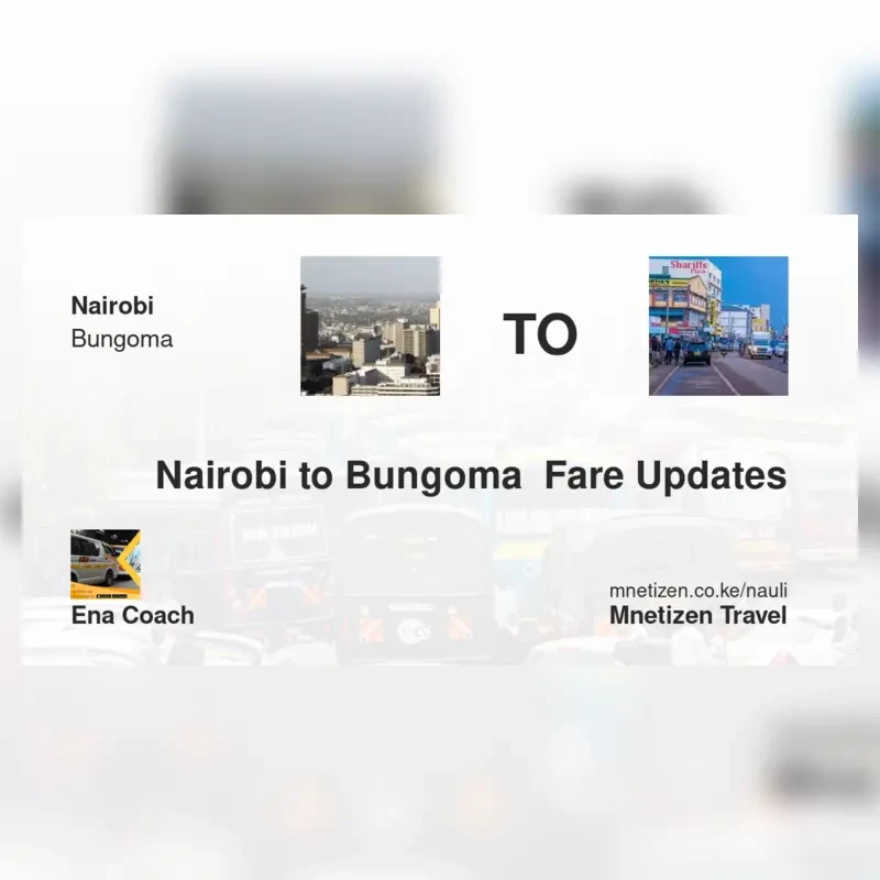 The fare from Nairobi to Bungoma with ENA Coach is ksh 1,600. Prices may vary during holidays and school terms.