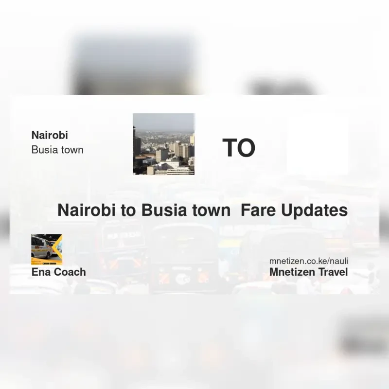 The fare from Nairobi to Busia Town with ENA Coach is ksh 1,600. Prices may vary during holidays and school terms.