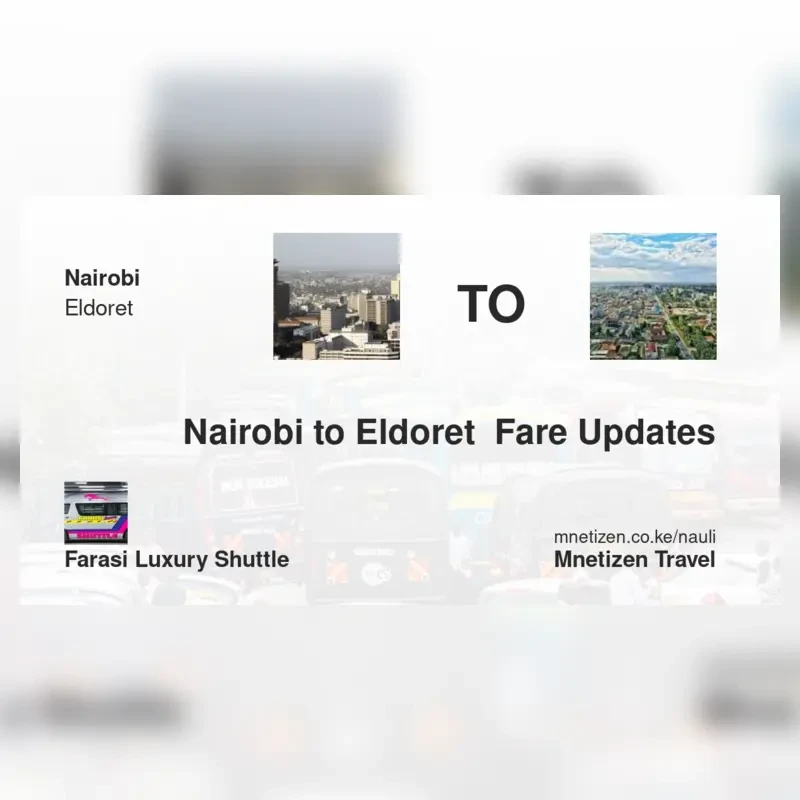 The fare from Nairobi to Eldoret with farasi Luxury Shuttle is ksh 1,400. Prices may vary during holidays and school terms.