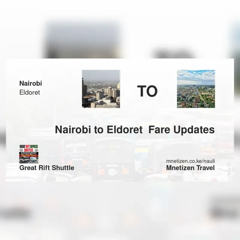 The fare from Nairobi to Eldoret with Great rift shuttle is ksh 1,200. Prices may vary during holidays and school terms.