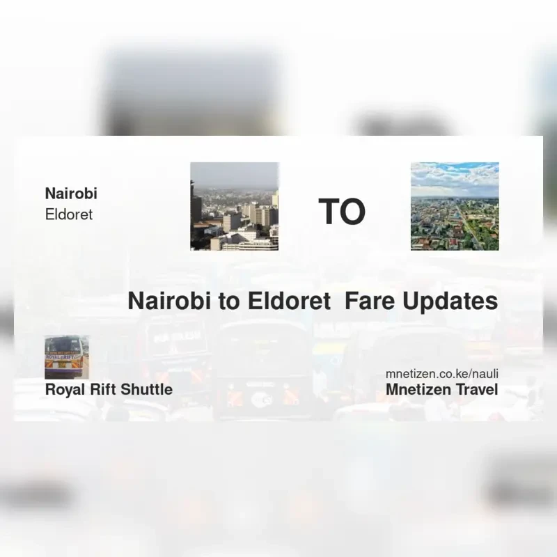 The fare from Nairobi to Eldoret with Royal Rift Shuttle is ksh 1,200. Prices may vary during holidays and school terms.