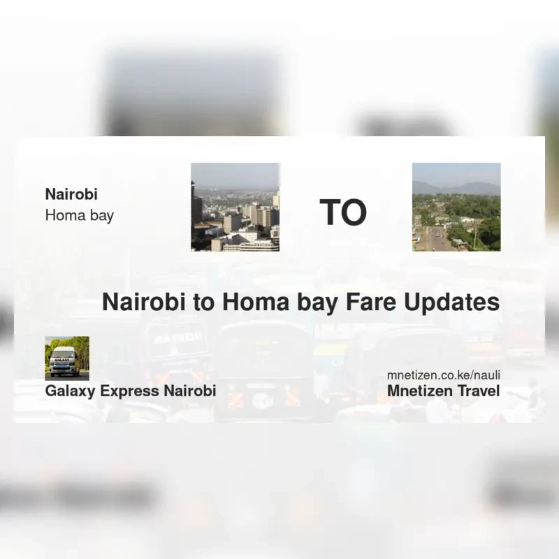 The fare from Nairobi to Homa Bay with Galaxy Express Nairobi is ksh 1,800. Prices may vary during holidays and school terms.