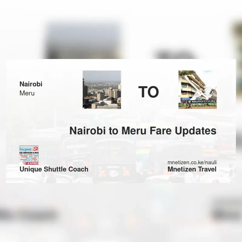 The fare from Nairobi to Meru with Unique Shuttle Coach is . Prices may vary during holidays and school terms.