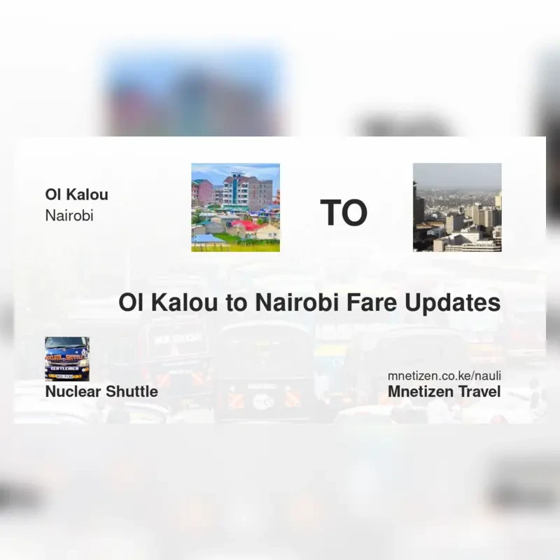 The fare from Ol Kalou to Nairobi with Nuclear Shuttle is ksh 600. Prices may vary during holidays and school terms.