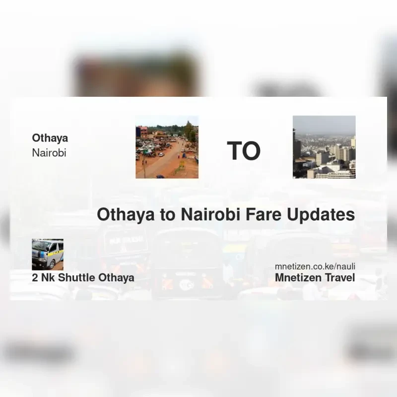 The fare from Othaya to Nairobi with 2NK Shuttle Othaya is . Prices may vary during holidays and school terms.