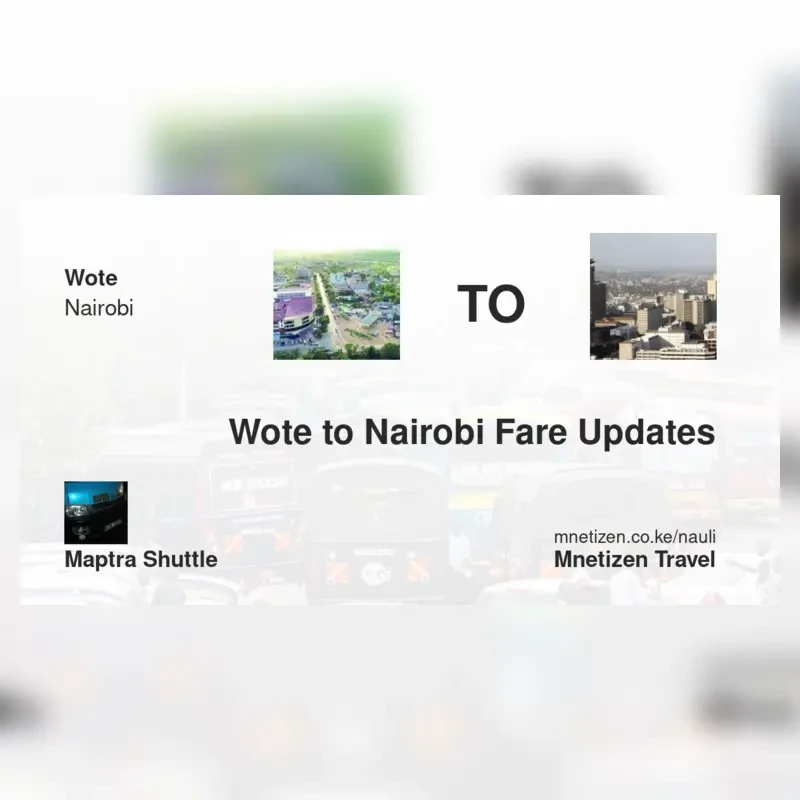 The fare from Wote to Nairobi with Maptra Shuttle is ksh 500. Prices may vary during holidays and school terms.