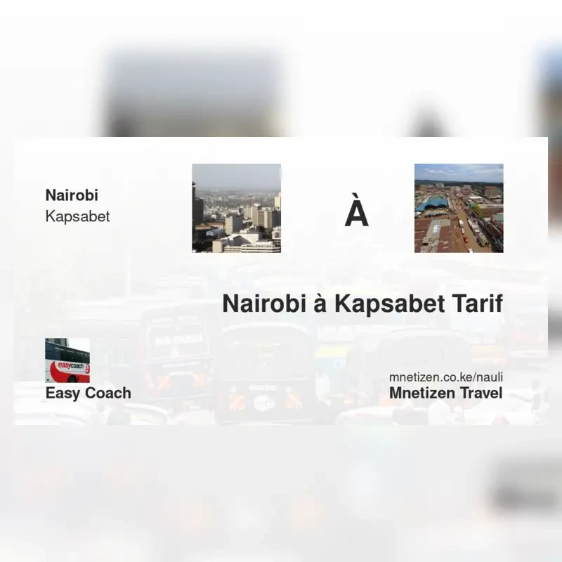 The fare from Nairobi to Kapsabet with Easy Coach is . Prices may vary during holidays and school terms.