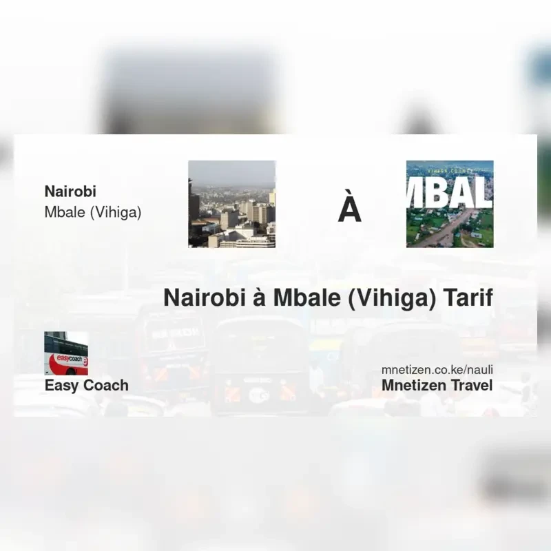 The fare from Nairobi to Mbale (Vihiga) with Easy Coach is . Prices may vary during holidays and school terms.
