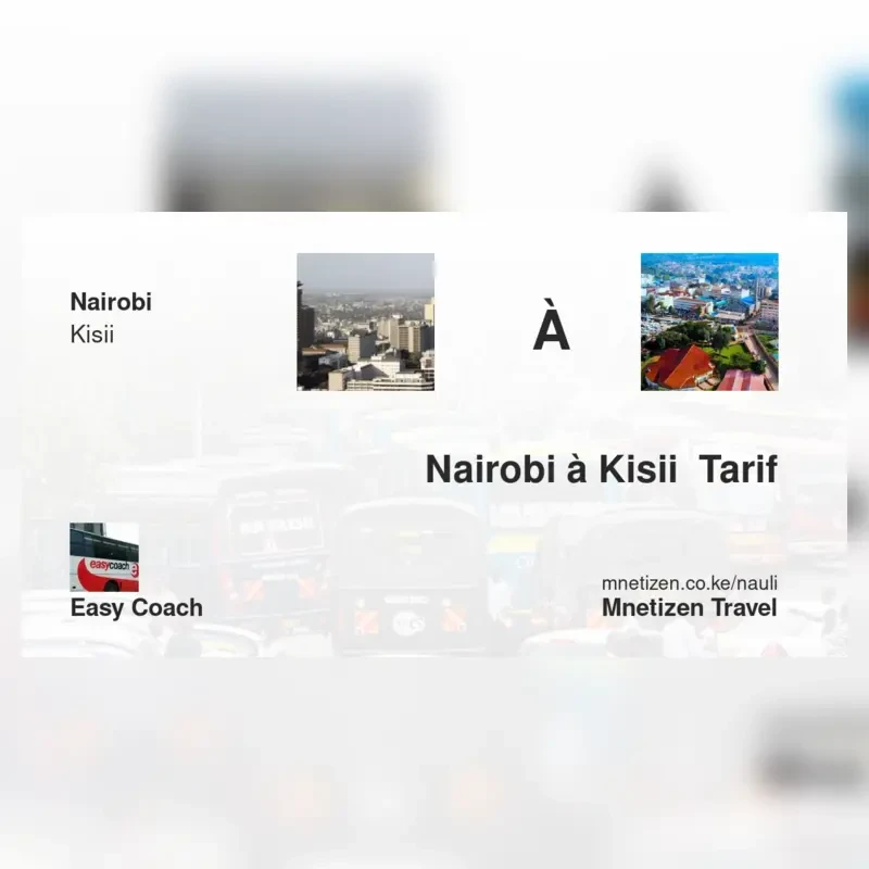 The fare from Nairobi to Kisii with Easy Coach is . Prices may vary during holidays and school terms.