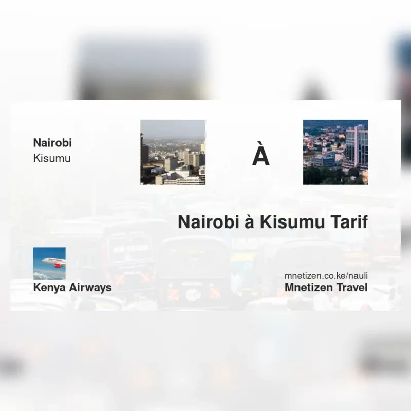 The fare from Nairobi to Kisumu with Kenya Airways is . Prices may vary during holidays and school terms.