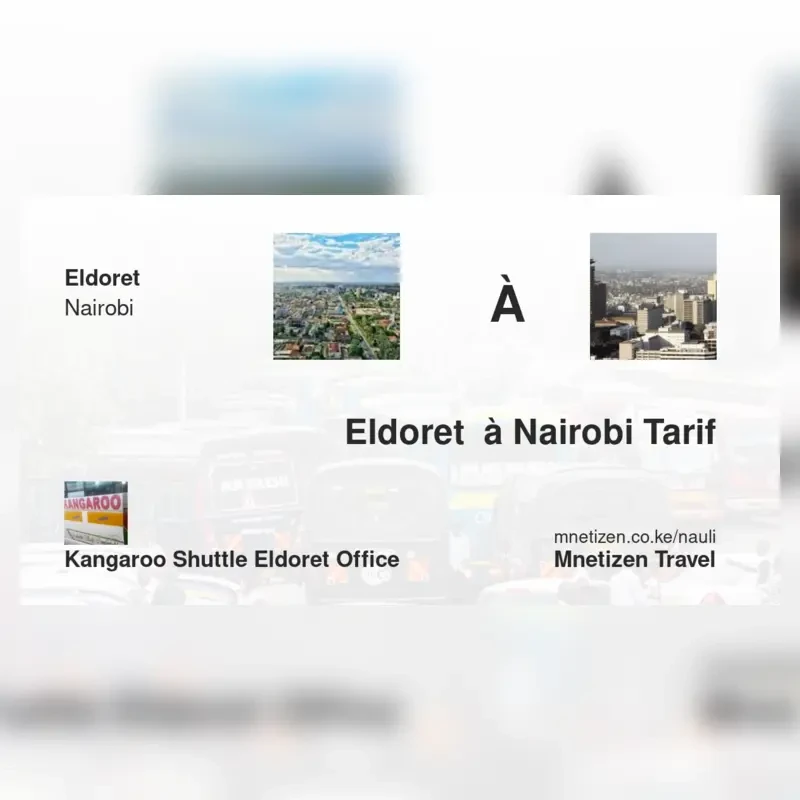 The fare from Eldoret to Nairobi with Kangaroo shuttle eldoret office is . Prices may vary during holidays and school terms.