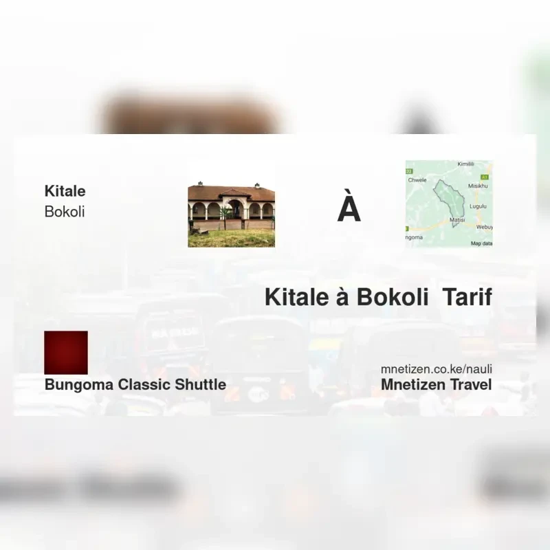 The fare from Kitale to Bokoli with Bungoma classic shuttle is . Prices may vary during holidays and school terms.