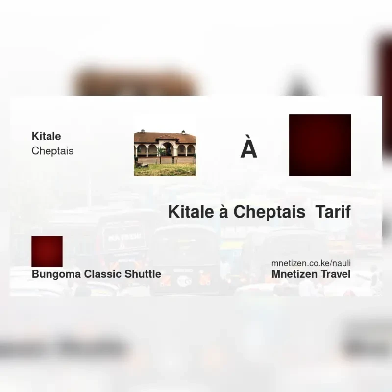 The fare from Kitale to Cheptais with Bungoma classic shuttle is . Prices may vary during holidays and school terms.