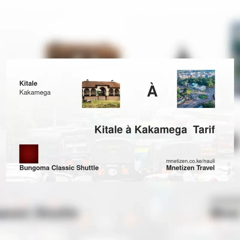 The fare from Kitale to Kakamega with Bungoma classic shuttle is . Prices may vary during holidays and school terms.
