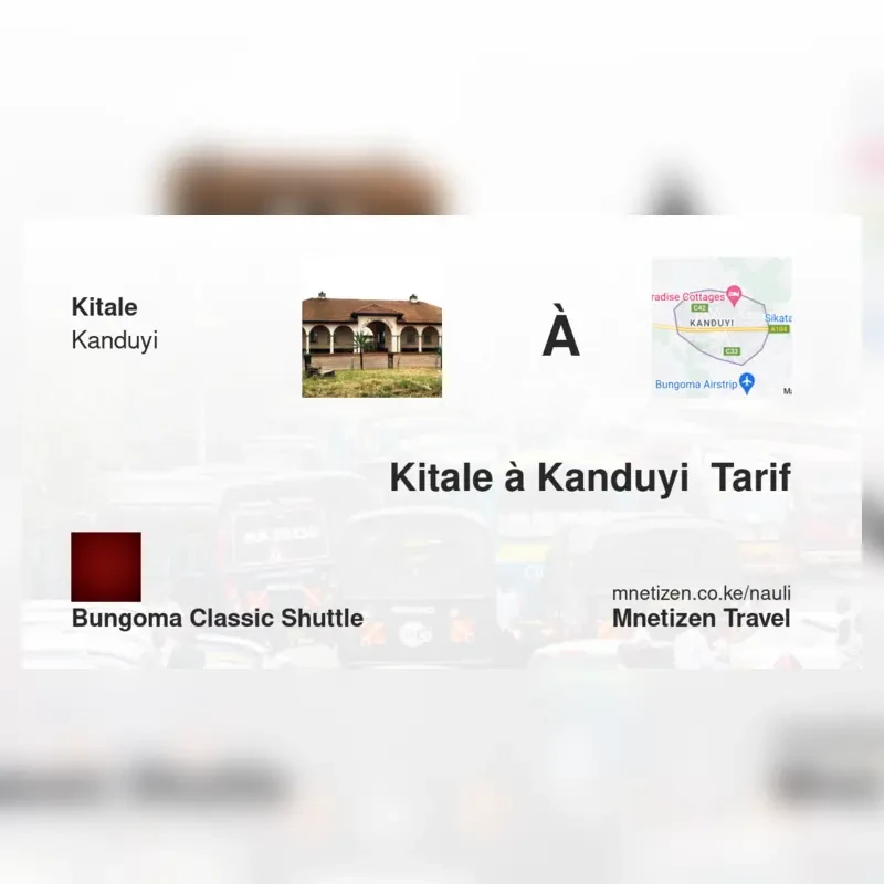 The fare from Kitale to Kanduyi with Bungoma classic shuttle is . Prices may vary during holidays and school terms.