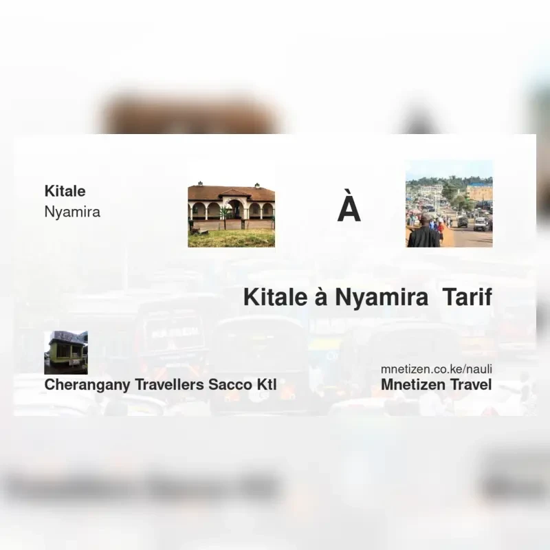 The fare from Kitale to Nyamira with Cherangany Travellers SACCO ktl is . Prices may vary during holidays and school terms.