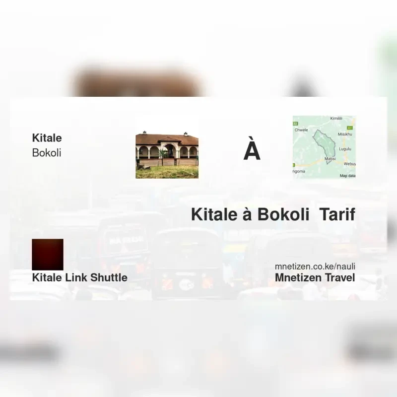 The fare from Kitale to Bokoli with Kitale Link shuttle is . Prices may vary during holidays and school terms.