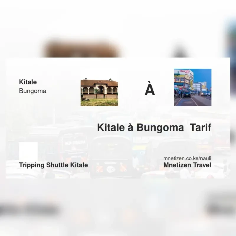 The fare from Kitale to Bungoma with Tripping shuttle kitale is . Prices may vary during holidays and school terms.
