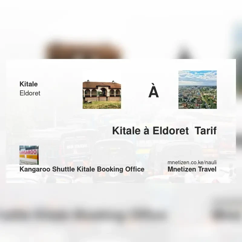 The fare from Kitale to Eldoret with Kangaroo shuttle kitale booking office is . Prices may vary during holidays and school terms.