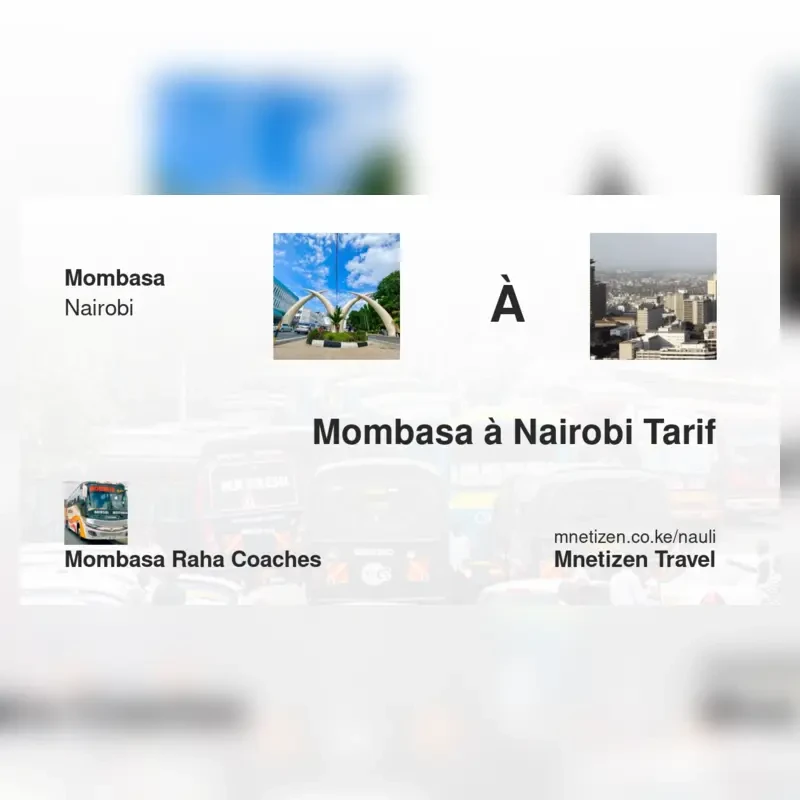 The fare from Mombasa to Nairobi with Mombasa Raha Coaches is . Prices may vary during holidays and school terms.