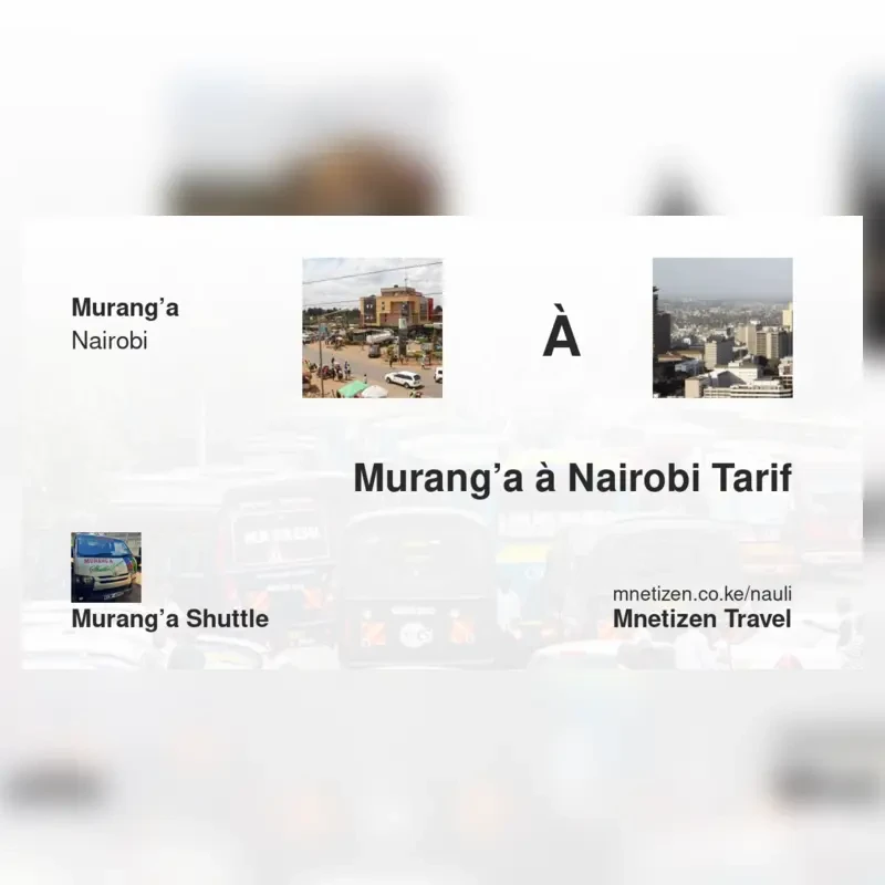 The fare from Murang’a to Nairobi with Murang’a Shuttle is . Prices may vary during holidays and school terms.