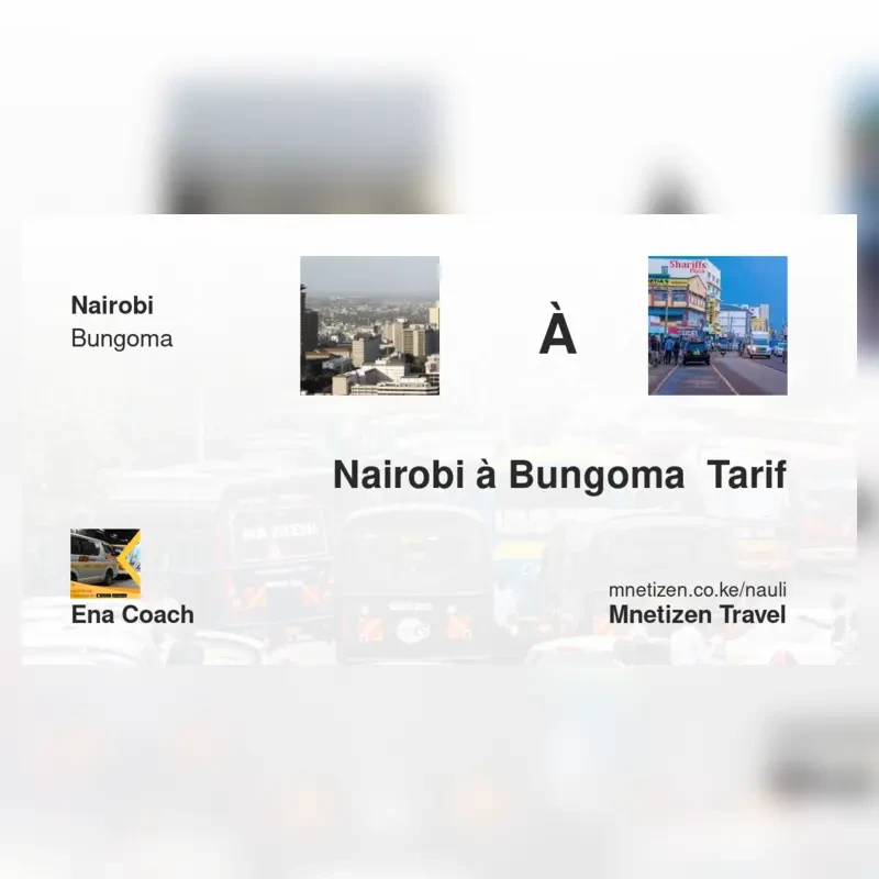The fare from Nairobi to Bungoma with ENA Coach is . Prices may vary during holidays and school terms.