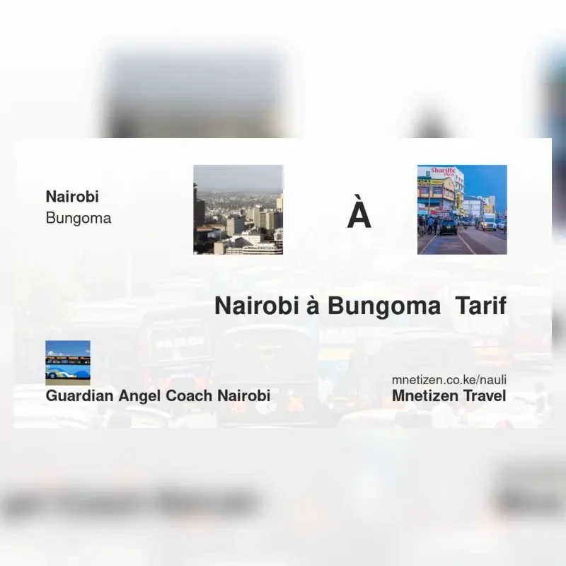 The fare from Nairobi to Bungoma with Guardian Angel Coach Nairobi is . Prices may vary during holidays and school terms.