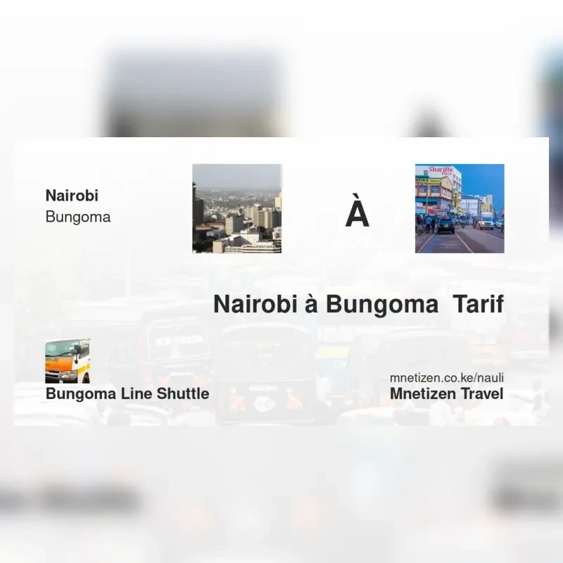 The fare from Nairobi to Bungoma with bungoma line shuttle is . Prices may vary during holidays and school terms.