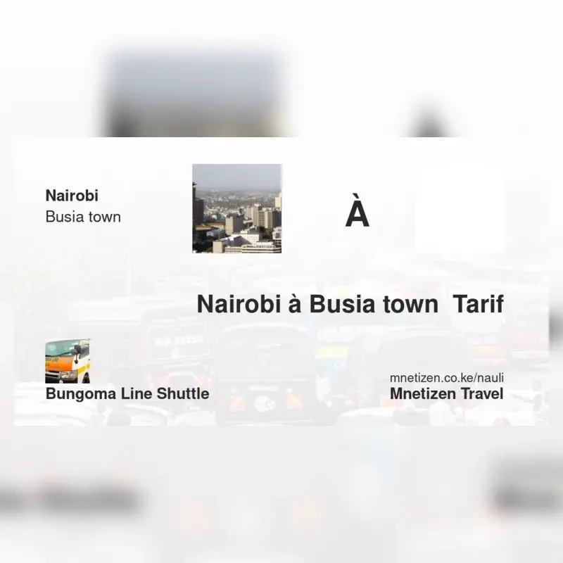 The fare from Nairobi to Busia Town with bungoma line shuttle is . Prices may vary during holidays and school terms.