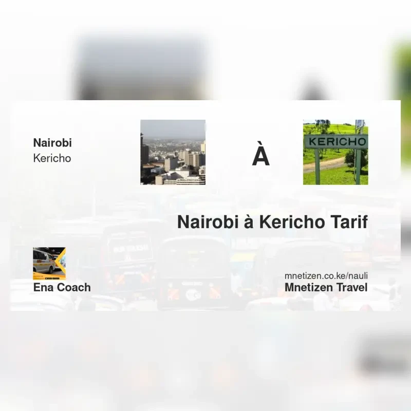 The fare from Nairobi to Kericho with ENA Coach is . Prices may vary during holidays and school terms.