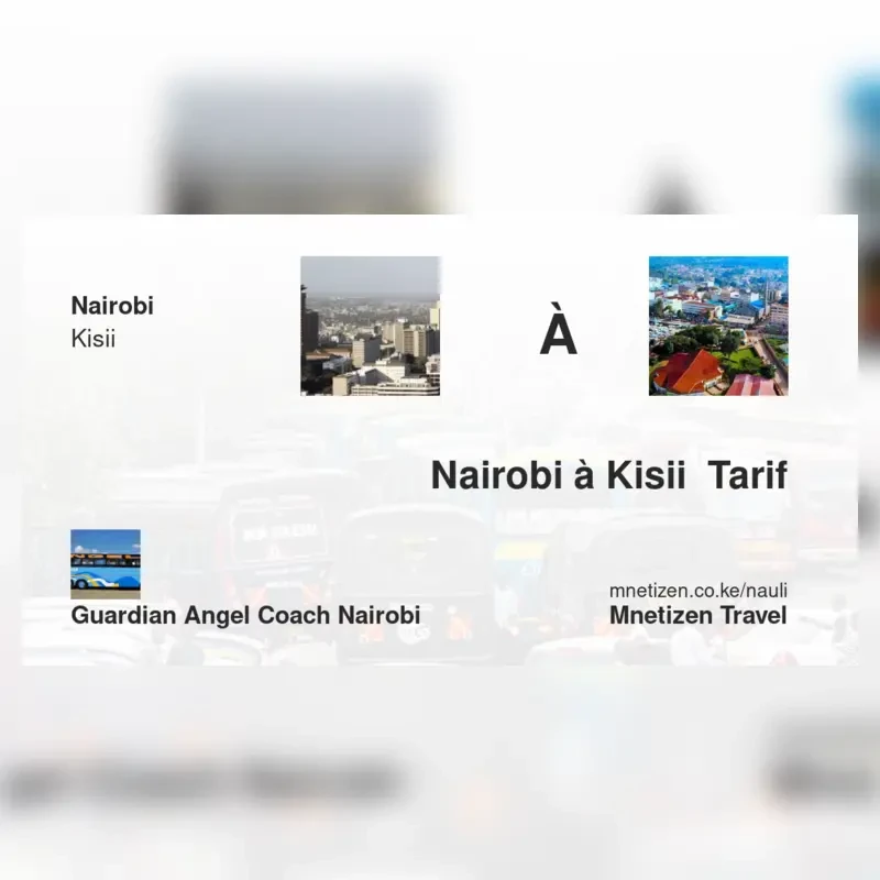 The fare from Nairobi to Kisii with Guardian Angel Coach Nairobi is . Prices may vary during holidays and school terms.