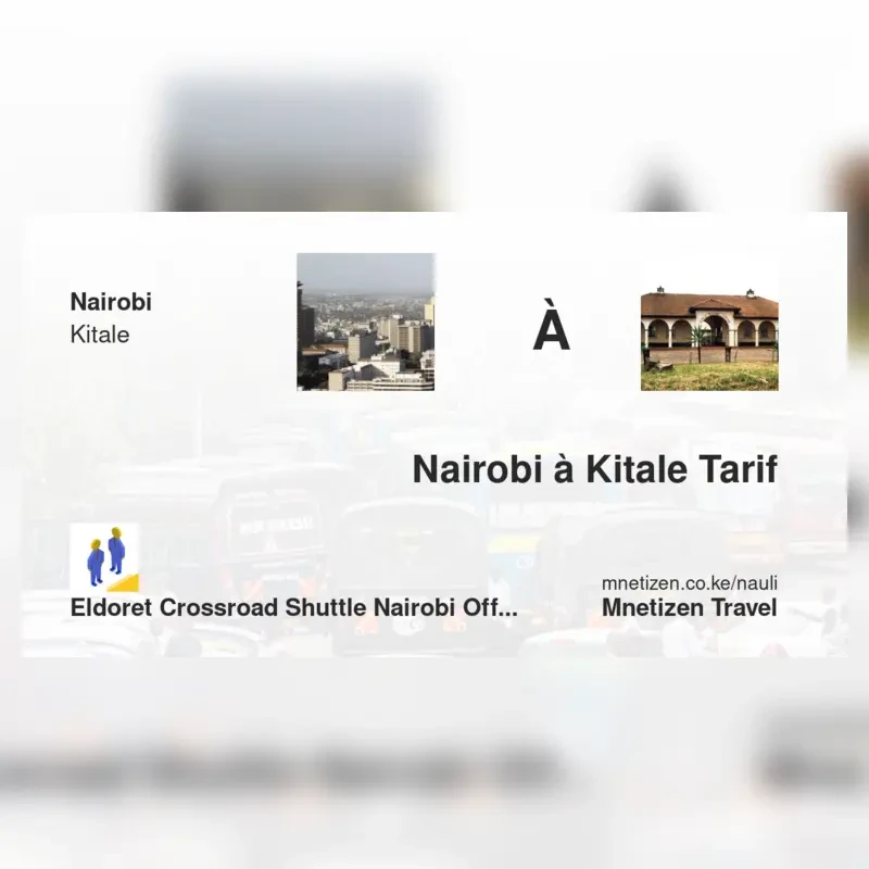 The fare from Nairobi to Kitale with Eldoret crossroad shuttle Nairobi office is . Prices may vary during holidays and school terms.