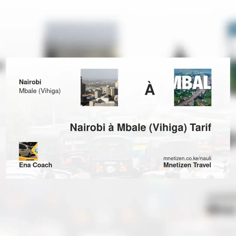 The fare from Nairobi to Mbale (Vihiga) with ENA Coach is . Prices may vary during holidays and school terms.